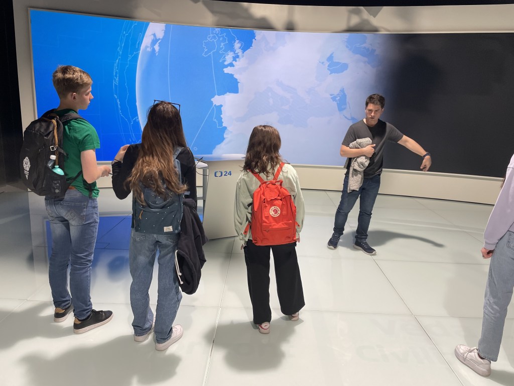 Poté jsme zamířili na Kavčí hory do budovy zpravodajství České televize, kde jsme měli předem domluvenou prohlídku s Jakubem Voříškem, moderátorem Zpráviček na ČT:D a absolventem našeho gymnázia. Podívali jsme se do studií, odkud se vysílají zpravodajské pořady, a poslechli jsme si, jak se připravují.