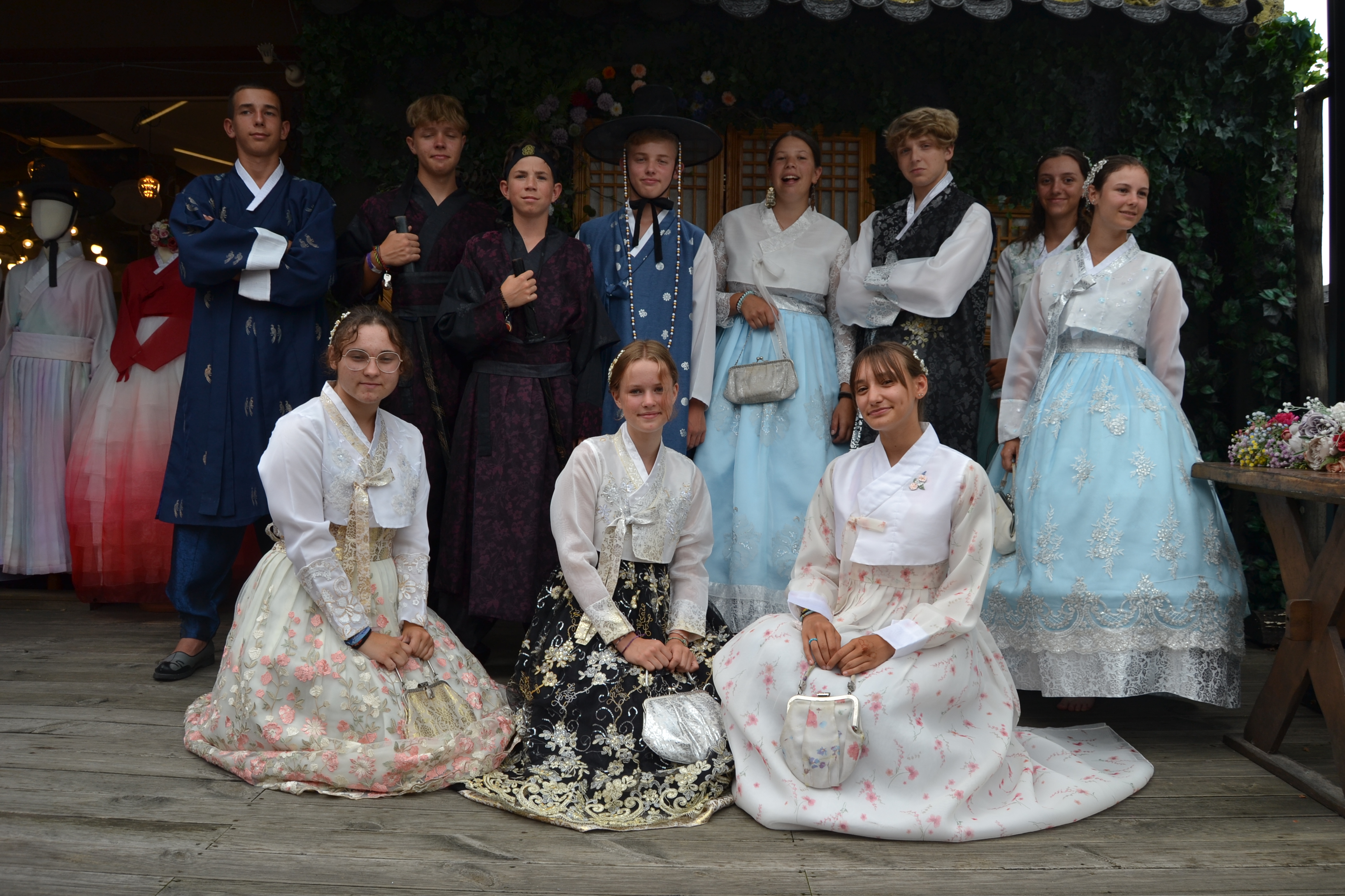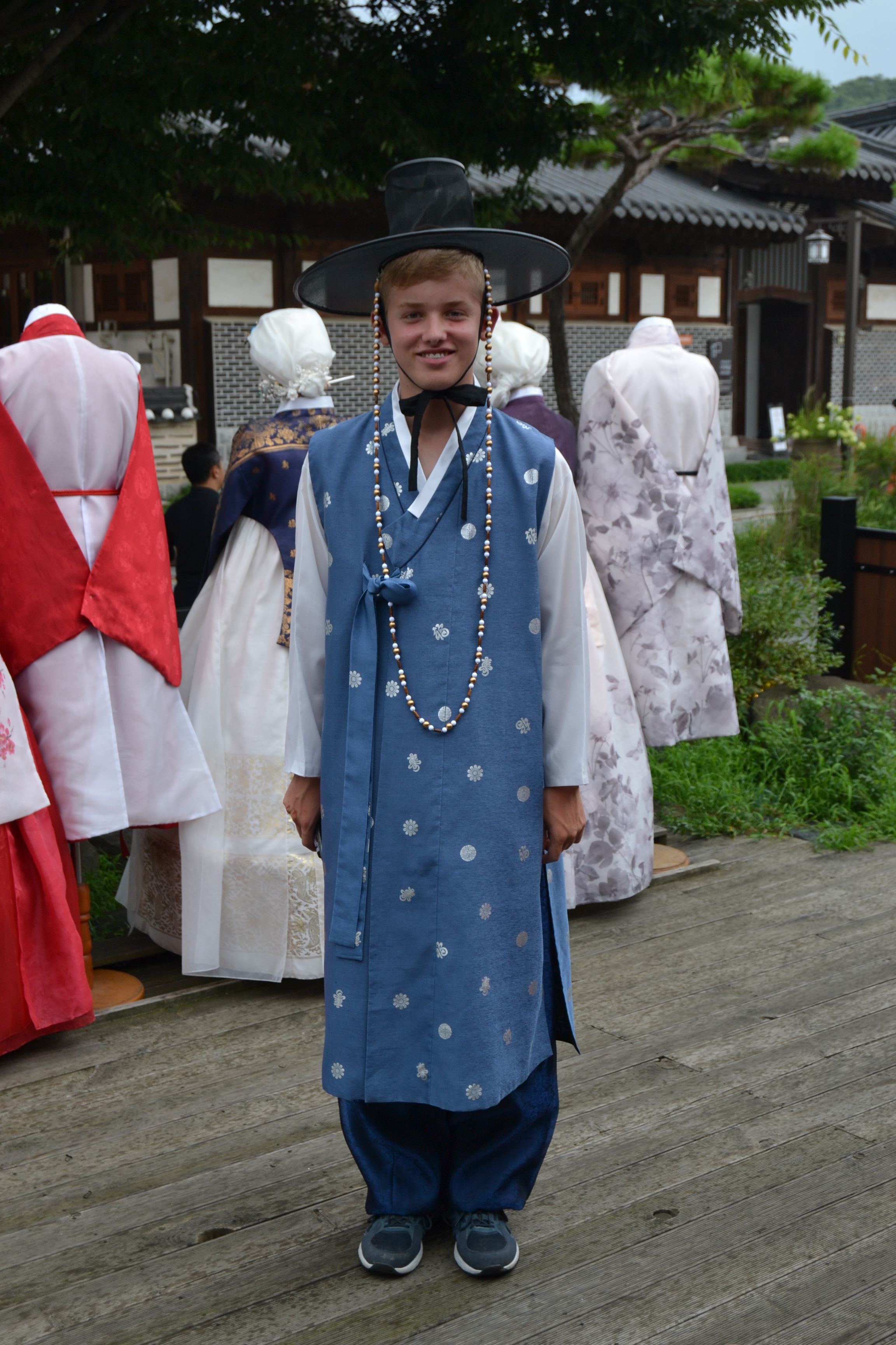 V autobuse nás uvítala průvodkyně Kay [kej], která se velmi podivovala naší únavě, protože před námi měla na starosti skupinu z Mexika, kteří jen co nasedli do autobusu, už začali pouštět hudbu a zpívat. První zastávka byla ve vesnici Jeonju [džondžu], kde jsme měli možnost si prohlédnout typické korejské domečky se zahnutými střechami – hanoky. Abychom si ještě více naladili do korejských tradic, mohli jsme si obléknout korejské kroje zvané hanboky a v nich se pak dvě hodiny procházet po Jeonju. Musím říct, že to byl neuvěřitelný zážitek, spočívající jen v tom, že jste se v horkém korejském počasí potili v šatech, které možná nebyly z pořádné bavlny a na hlavě jste měli kovový síťovaný klobouk, jenž neskutečně tlačil do hlavy. Ale stále to bude vzpomínka, kterou vám nikdo nevezme. Pak jsme hanboky vrátili a odebrali se jsme na koleje univerzity v Jeonbuku [džonbuku], kde jsme měli zaplacené tři noci.