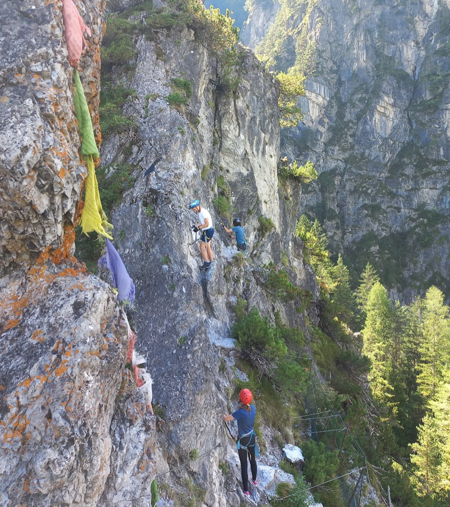 Cesta byla dlouhá, na penzion jsme přijeli až v sedm hodin večer po téměř deseti hodinách v autobuse. Úterý byl den asi nejnáročnější, kurz jsme totiž započali celodenní túrou, při které jsme zdolali více než 650 metrů výškového převýšení. Součástí byla i krásná výhledová ferrata obtížnosti A/B a pro ty, kteří už byli zkušenější, se nabídla i ferrata obtížností C/D. My ostatní jsme se zastavili v horské chatě Karlsbader hütte a po odpočinku se vydali zpět k autobusu.