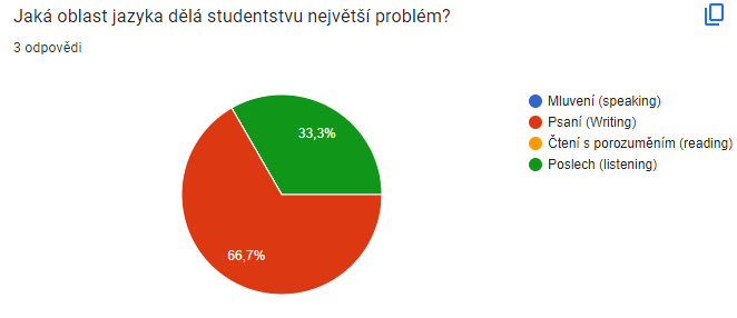 Učitelka angličtiny: „ Nedá se říct, že bych se nejvíce zaměřovala jen na jednu věc. Snažím se, aby hodiny a celkově výuka byla komplexní a rozvíjela všechny dovednosti. Ze strany studentů/studentek se objevil zájem o víc mluvení, takže to se teď snažím zapojovat více, nicméně všichni z toho nadšení nejsou, takže i tam se snažím najít balanc.“