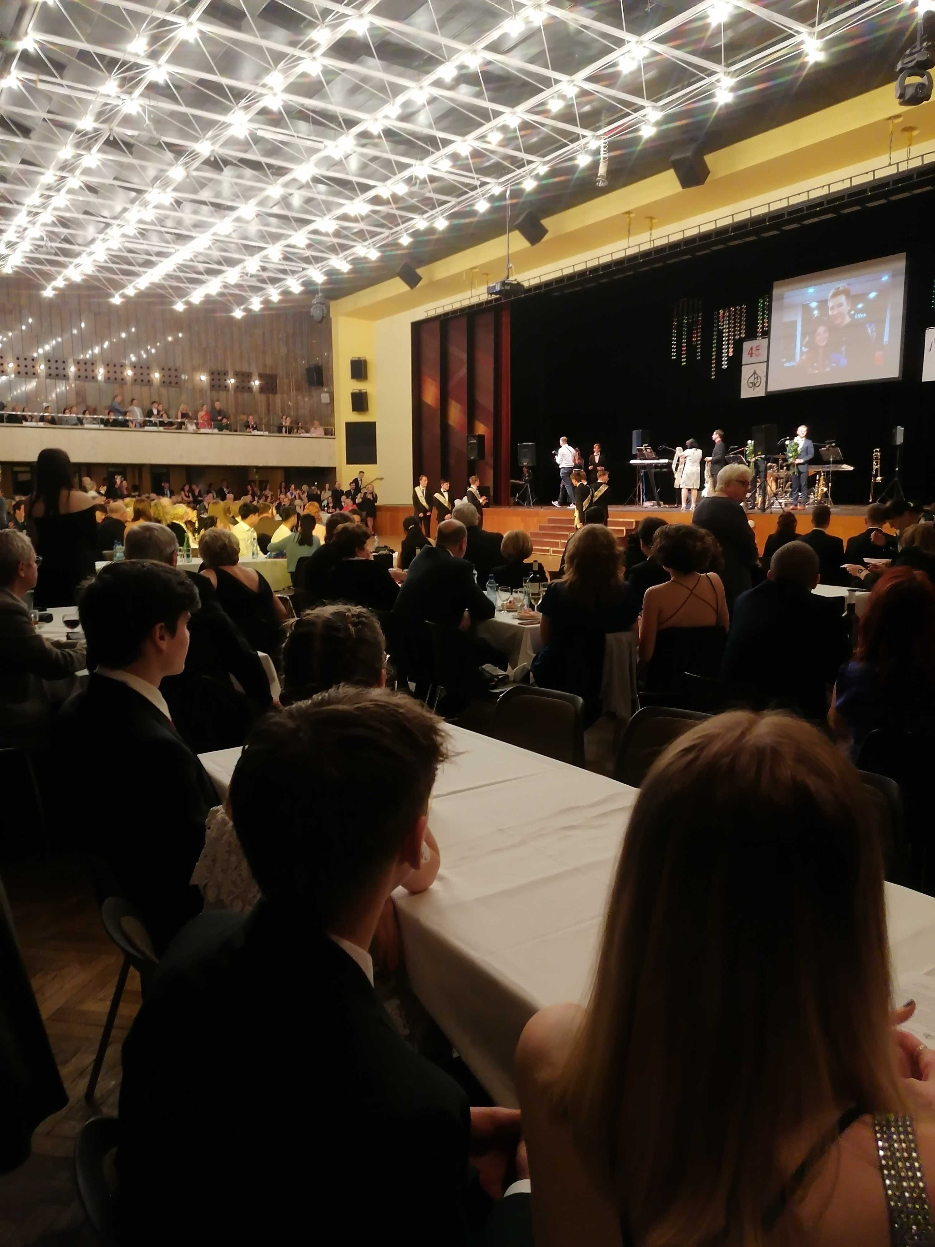 Pospíchám rychle nahoru, abych alespoň něco stihl. Ve Velkém sále je už všechno v plném proudu: maturantky a maturanti jsou nastoupení uprostřed sálu a kolem nich sedí u stolů rozplývající se rodiče a další rodinné příslušnice a příslušníci širokých rodin maturujících.