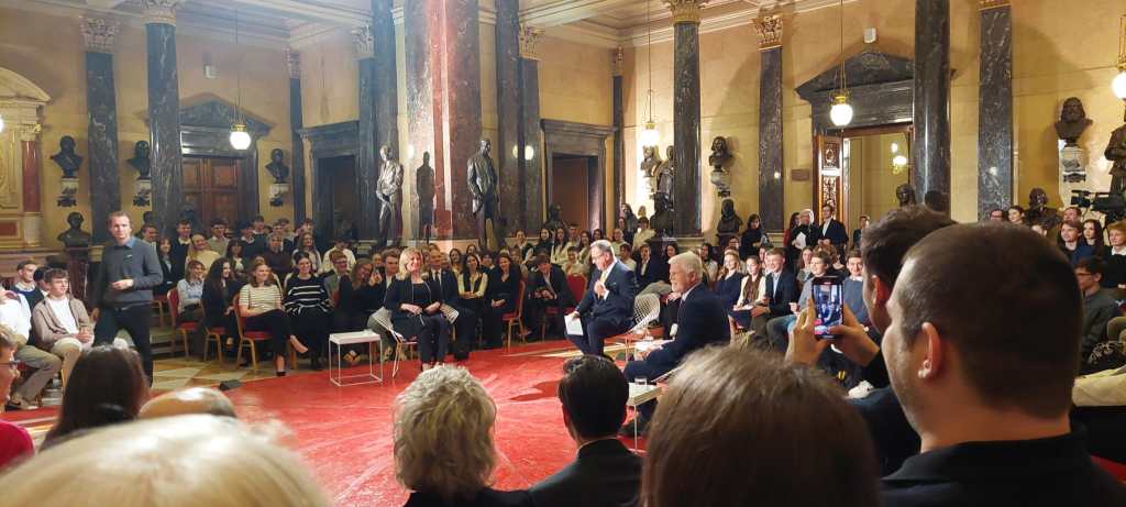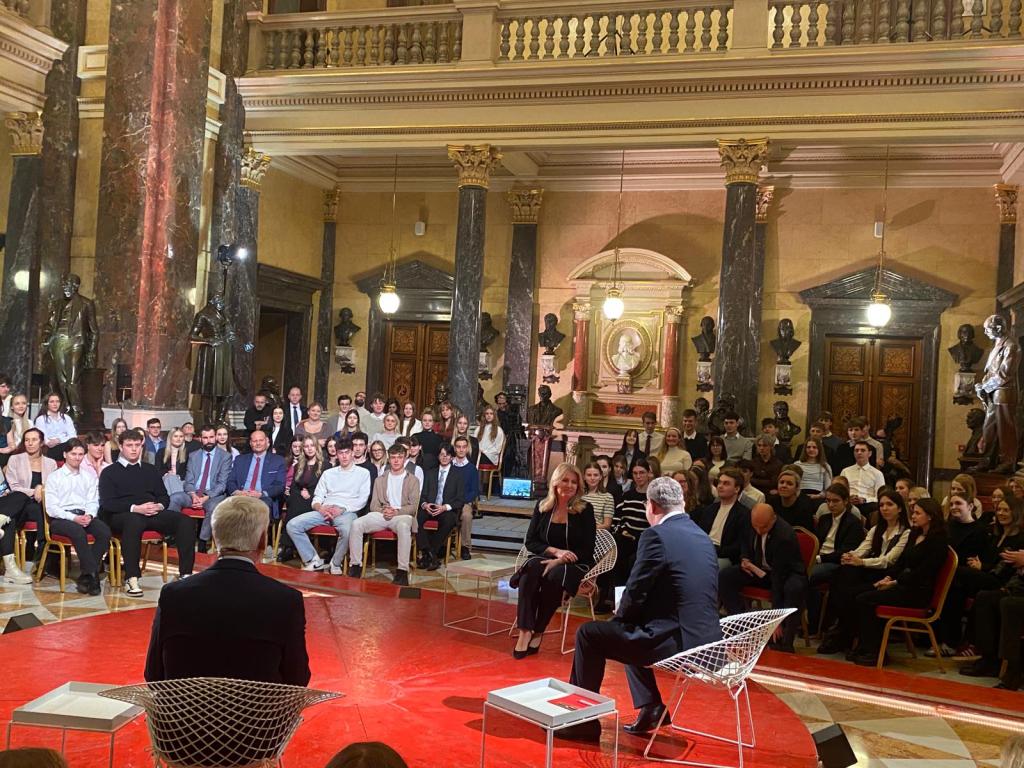 Panelová diskuse začala s dvěma hvězdami večera: prezidentem Pavlem a bývalou prezidentkou Slovenska Čaputovou. Na začátku prezidentka vzpomínala na svých pět let ve funkci. Opět zopakovala, že nelituje toho, že post neobhajovala. Debata poté pokračovala tématem regulace sociálních sítí a svobodného projevu. K tématu vracení se mladých lidí zpět do vlasti se prezident republiky vyjádřil, že pro ně země musí zůstat atraktivní.