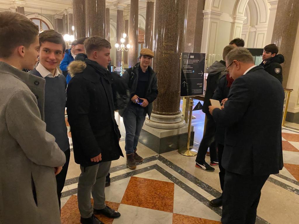 Problém nastal ve chvíli, kdy „Tyláci“ dostali hlad a neměli co jíst. Jejich doprovod je proto vyslal do mekáče naproti muzeu a zbytek na ně musel čekat. Díky tomu jsme si mohli udělat pár fotek s panem Moravcem, který se za námi přišel podívat. Skupinu z Tyla jsme potkali cestou k autobusu a za malou chvíli jsme opouštěli Prahu směrem zpět do Hradce.