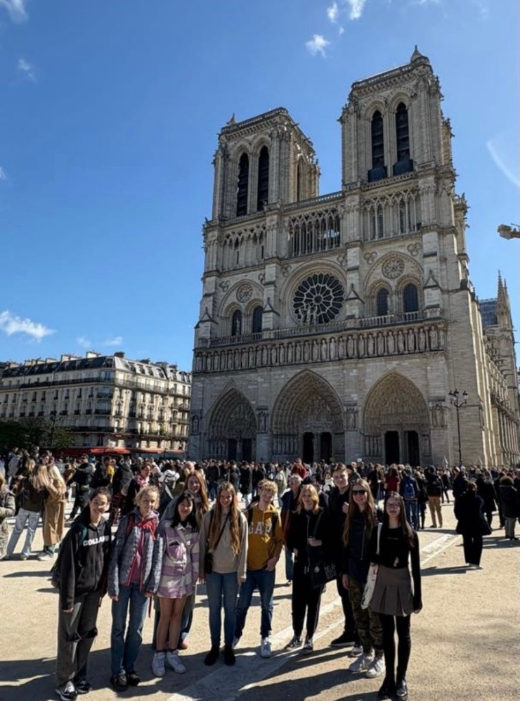 Pátek 28.3.2025 kolem 17. h přijížděl autobus už i se souborem z Prostějova, v 18h jsme odjížděli z Hradce Králové do Francie. Naše cesta byla dlouhá až 19 hodin i s přestávkami na benzinkách. Náš první cíl byla Paříž, kde jsme se s Prostějovem dali rozchod. My jsme jeli metrem do Notre-Dame, tam jsme měli menší rozchod, po kterém jsme si zašli do parku, kde jsme se najedli a zkoušeli naši hru. Po zkoušce jsme vyrazili k Louvru. Během cesty nás zastavila nová galerie plná různých umělců s díly nejrozmanitějších stylů. Když už jsme dorazili k Louvru, udělali jsme si pár fotek a šli dál až k Eiffelově věži, kde jsme si dali rozchod. Po něm jsme jeli zpátky k našemu autobusu, který nás i Prostějováky odvezl do hotelu, ve kterém jsme přespávali jednu noc. Plán na druhý den byl jasný: naše první zastávka byla v Muzeum of the 24 Hours of Le Mans (muzeu automobilů), potom jsme jeli do města Mont-Saint-Michel, následně nás autobus odvezl do Saint-Mala, kde na nás už čekaly rodiny, u kterých jsme na týden přespávali.
