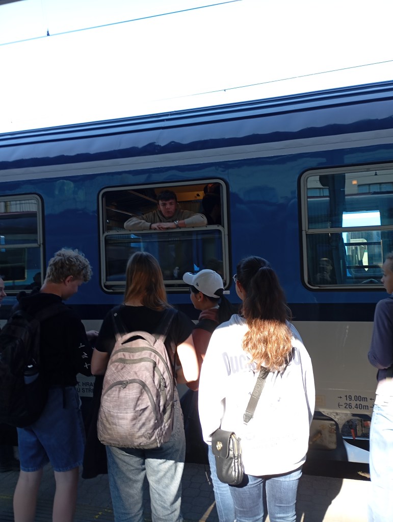 V úterý ráno jsme se všichni sešli na královéhradeckém Hlavním nádraží. Následovalo loučení a předávání drobných dárků s logem GYBONU. Na nástupiště jsme šli společně s Francouzi, abychom využili čas do poslední minuty. V 9:08 se rychlík směřující do Prahy vydal na svou cestu a my všichni jsme si trochu smutně zamávali. Teprve, když vlak docela zmizel, vydali jsme se do školy, kde nás po rušném a originálním týdnu čekala normální výuka. A život se vrátil do původních kolejí.