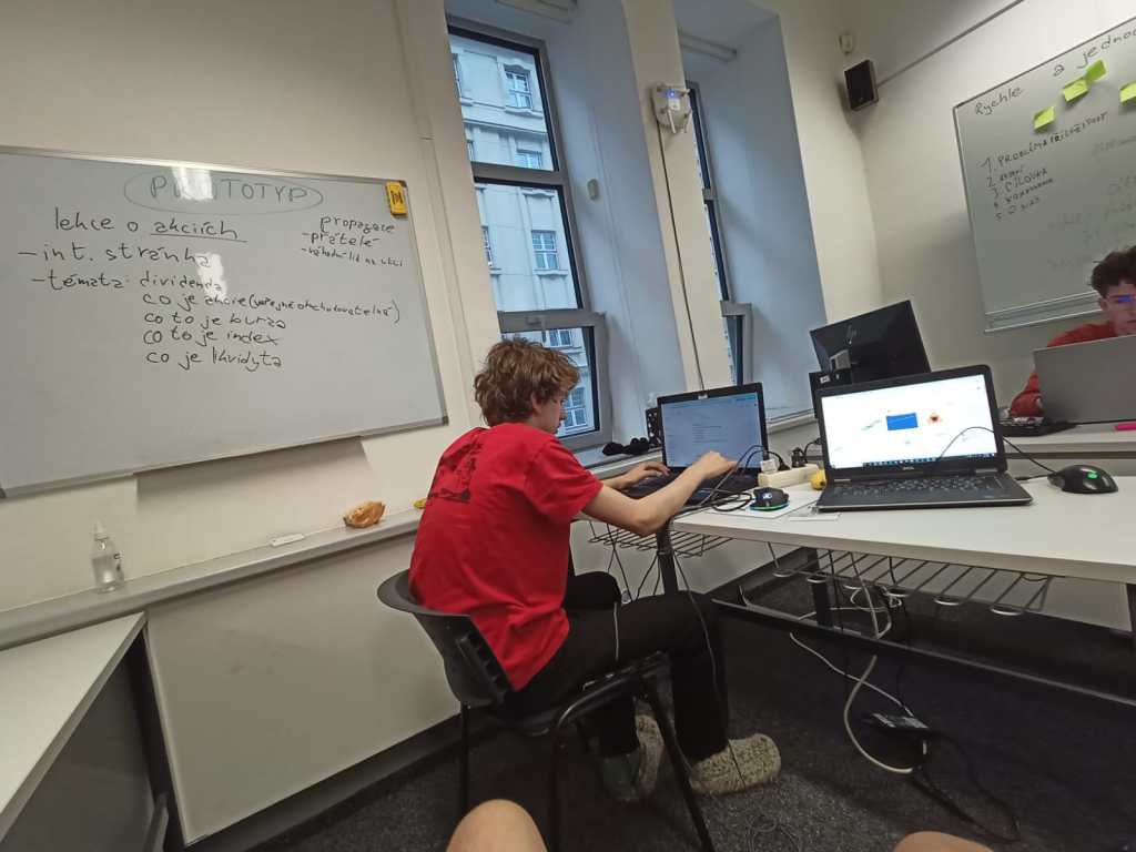 A tak přišel onen osudný den, pátek 30. května léta páně 2025, kdy v 13:30 měl být začátek soutěže. Když jsem přijel, tak jsem zjistil, že ať jde, o co jde, konkurence je vysoká, protože průměrný věk se pohyboval okolo 18 let. Byli jsme zavedeni do přednáškové místnosti, kde jsme se konečně dozvěděli, o čem onen hackathon je. Sdělili nám, že se jedná o soutěž, při které budeme tvořit pitch (prezentaci) na start up, který během tohoto víkendu vymyslíme, a budeme ho prezentovat porotě. Tím nejdůležitějším, co se dalo vyhrát, byla pomoc s realizací start upu od VŠCHT pro první 3 místa. Následovaly přednášky týkající se vytváření start upu. Poté jsme se dali do věci, která ovlivnila zbytek dění. Šlo o tvoření týmů, který jsem utvořil s legendárním Matějem Tabachem a jeho kamarádem ze Zatlanky Jurou Semerádem. Hned po stvoření týmu jsme už věděli, co chceme stvořit, aplikaci, která by učila lidi, jak investovat, InvestiGO. Hned po tomto boji o lidské zdroje se strhl boj o učebny, ve kterých bude tým pracovat. Ovšem jediným rozdílem mezi učebnami byla jejich velikost, jinak všechny byly vybaveny hordou tabulí, projektory a pomůckami od papírů přes magnetky až po fixíky. Bylo nám hned jasné, že po nás chtějí, abychom vydali stoprocentní výkon za ten víkend a neomezovala nás žádná materiální stránka. Začali jsme tedy s navrhováním, jak to bude vypadat. Ale brzy jsme přestali, protože už byla skoro půlnoc.